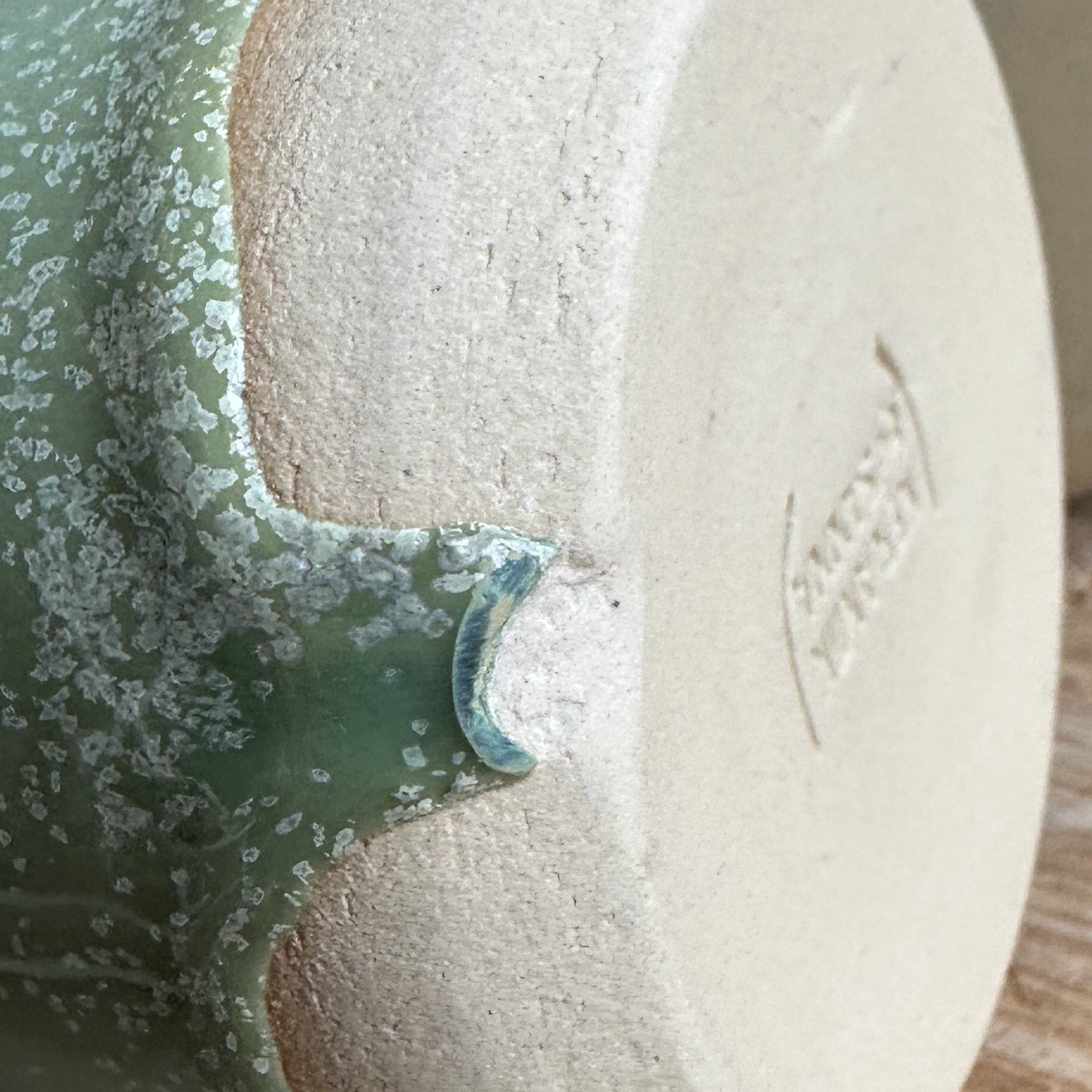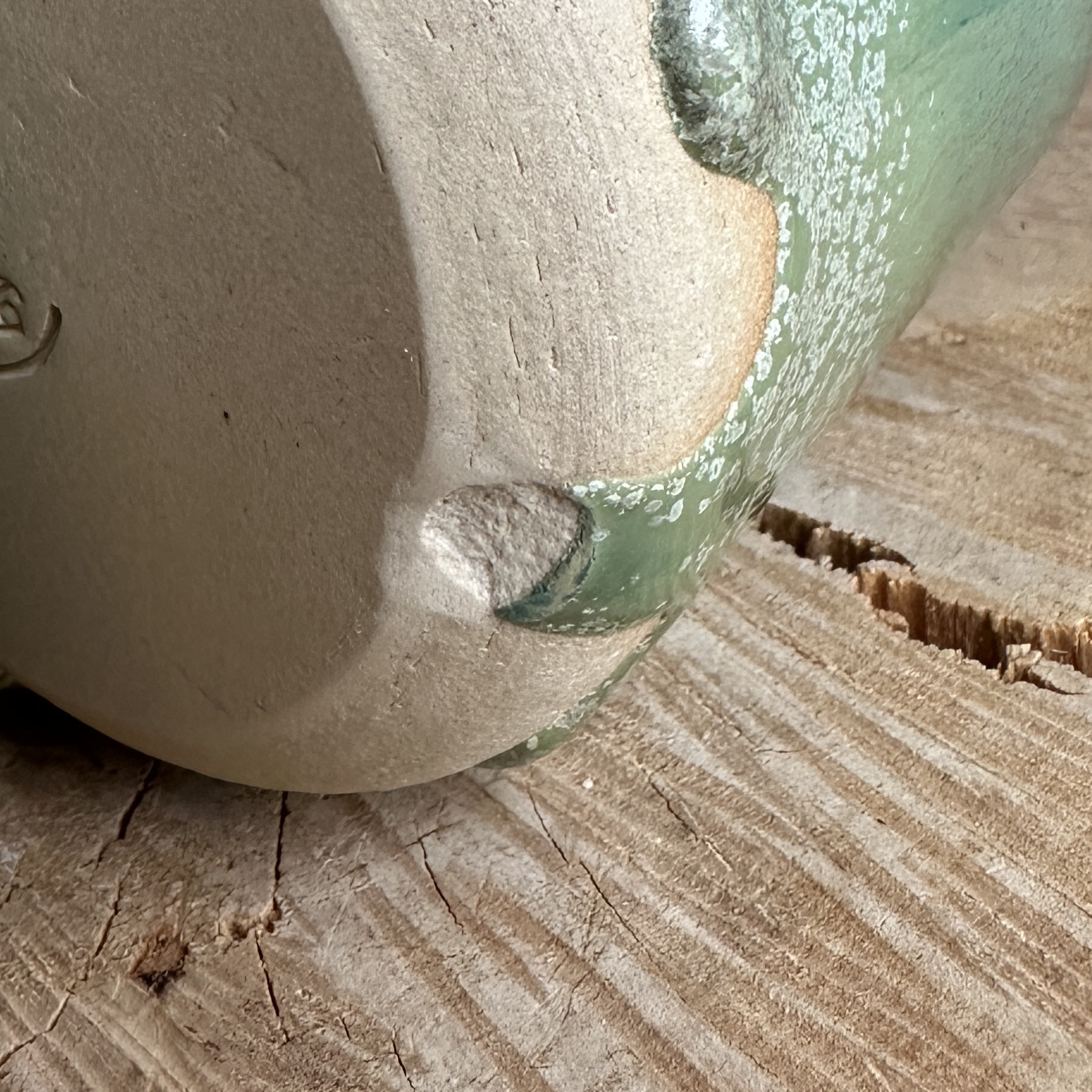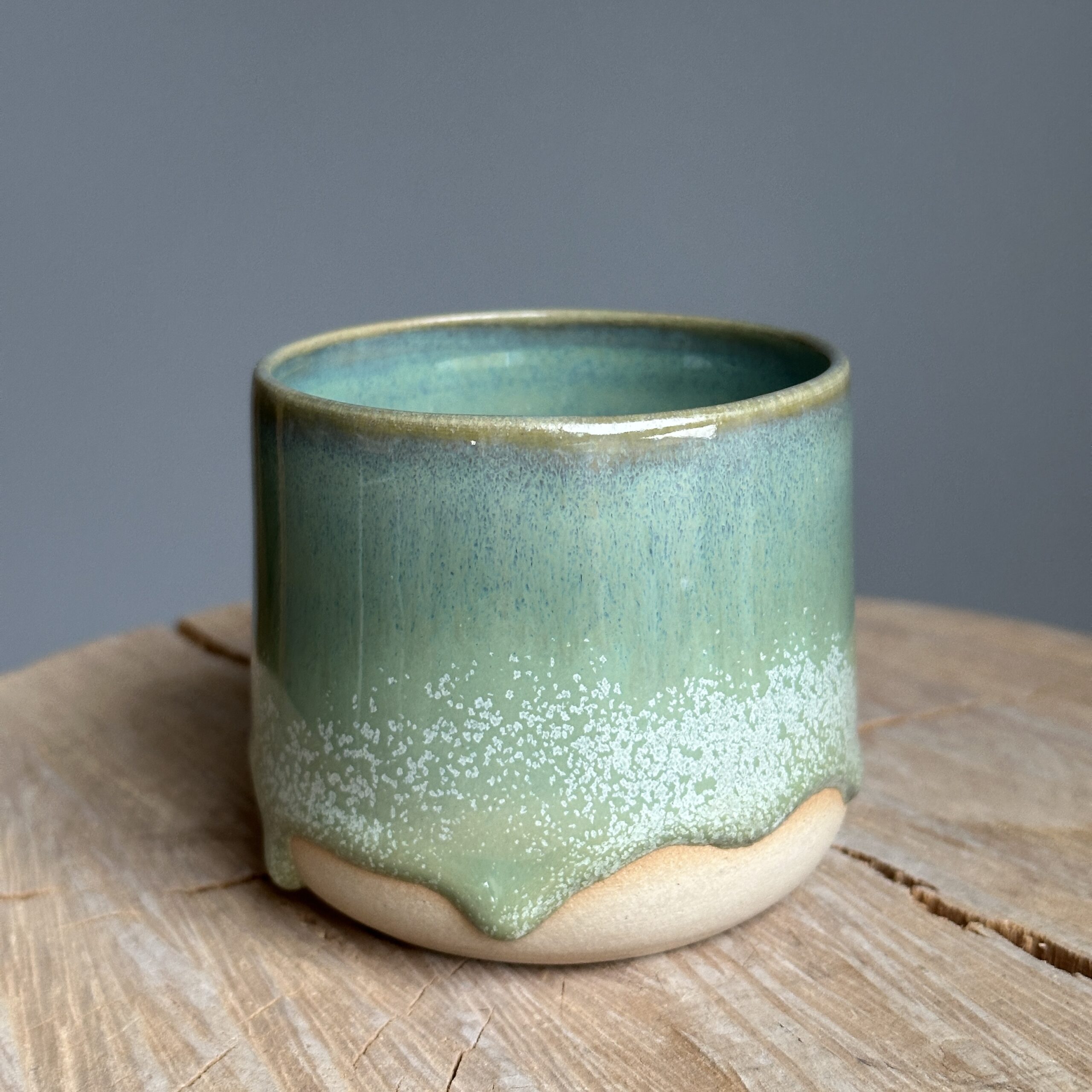 Håndlavet kop i lys ler med Engvår glasur – blank lysegrøn med blåligt skær, hvide nister og smukke glasuraflejringer nederst, der giver hver kop unik karakter.