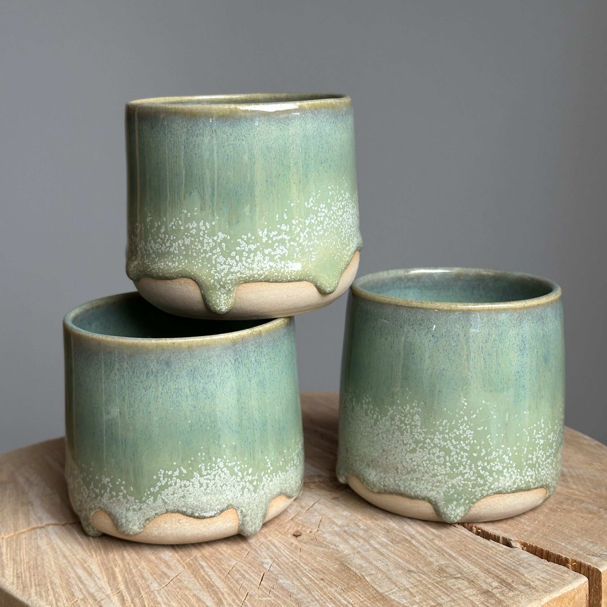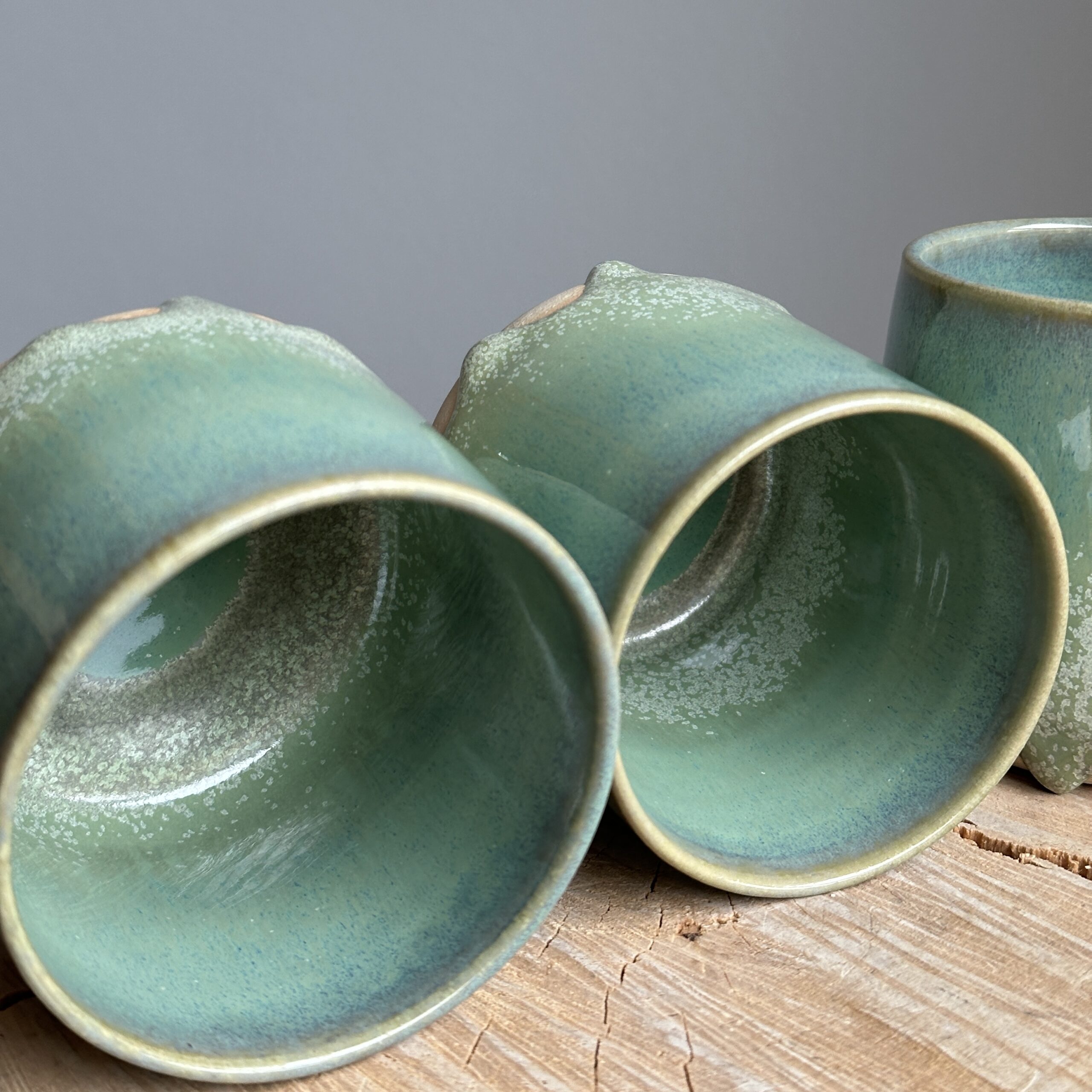Engvår kop er håndlavet i lys stentøjsler og glaseret med en blank, lysegrøn glasur med blåligt skær og fine hvide nister. Glasuren samler sig smukt i en lidt tykkere kant forneden, og ind imellem løber den let, hvilket giver hver kop et levende, unikt udtryk og fremhæver håndværkets charme.