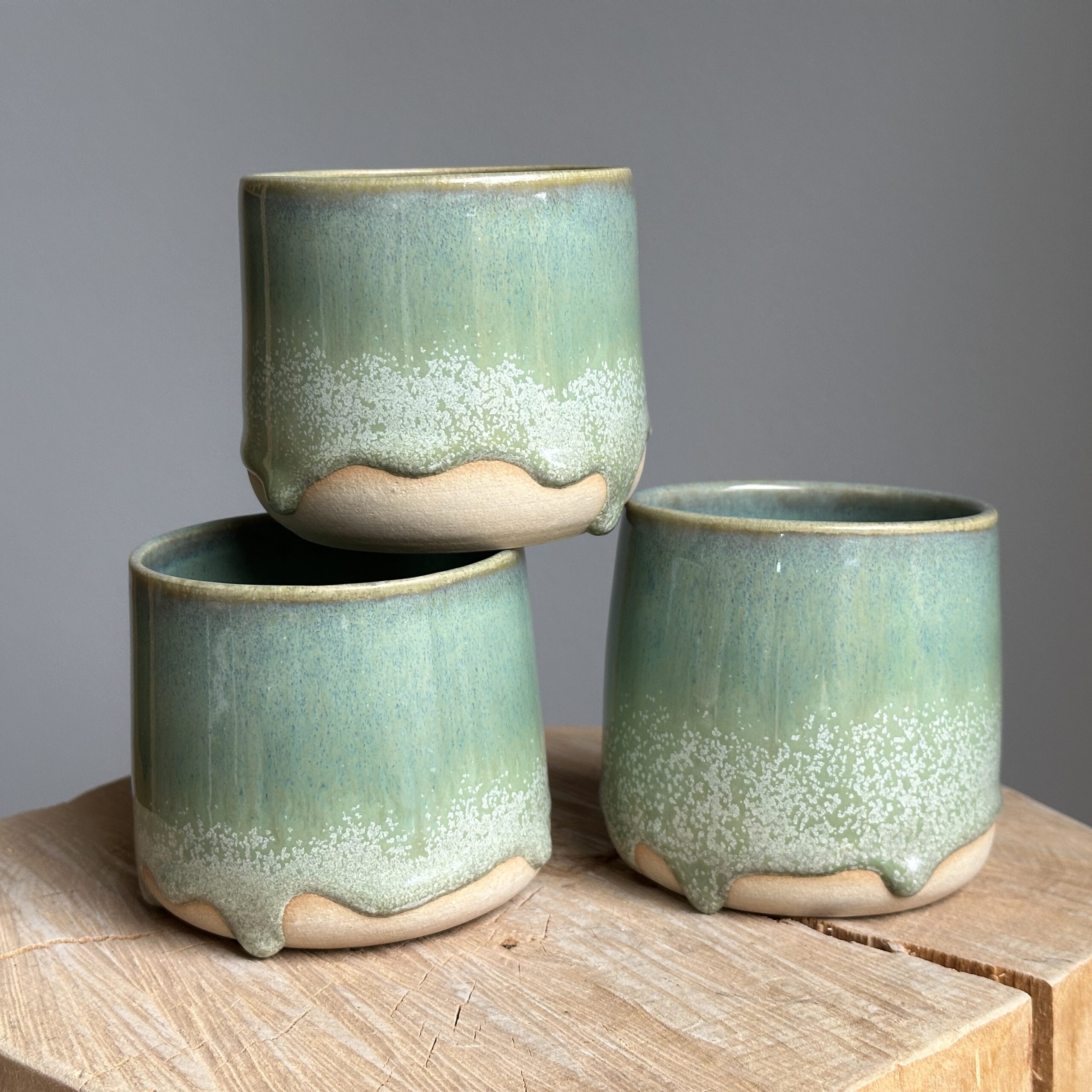 Håndlavet kop i lys ler med Engvår glasur – blank lysegrøn med blåligt skær, hvide nister og smukke glasuraflejringer nederst, der giver hver kop unik karakter.