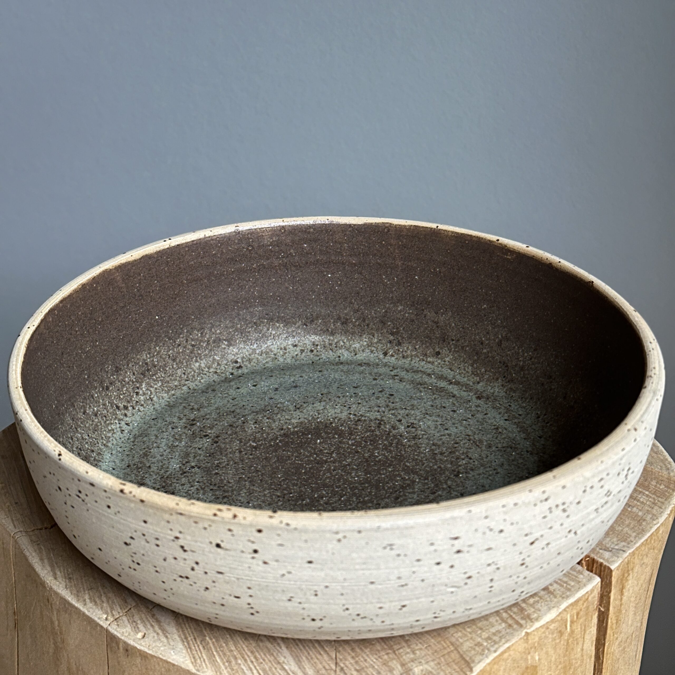 Bring naturens ro til bordet med denne håndlavede skål, formet i lavaplettet lys stentøjsler og glaseret med en jordnær brun/irgrøn glasur. Farvespillet minder om nordiske landskaber – mos, sten og jord – og giver hvert stykke sin egen unikke karakter.
