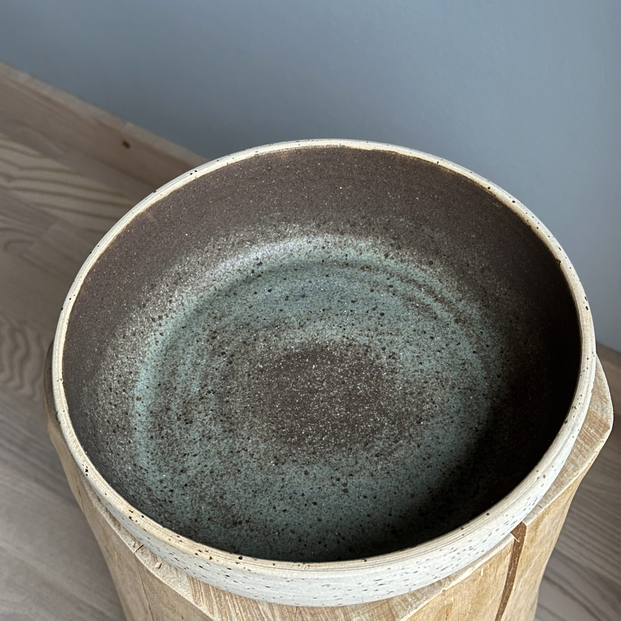 Smuk håndlavet skål i lavaplettet lys ler med jordnær brun/irgrøn glasur. Inspireret af den nordiske natur med et rustikt, levende udtryk – perfekt til morgenmad, servering eller dekoration.