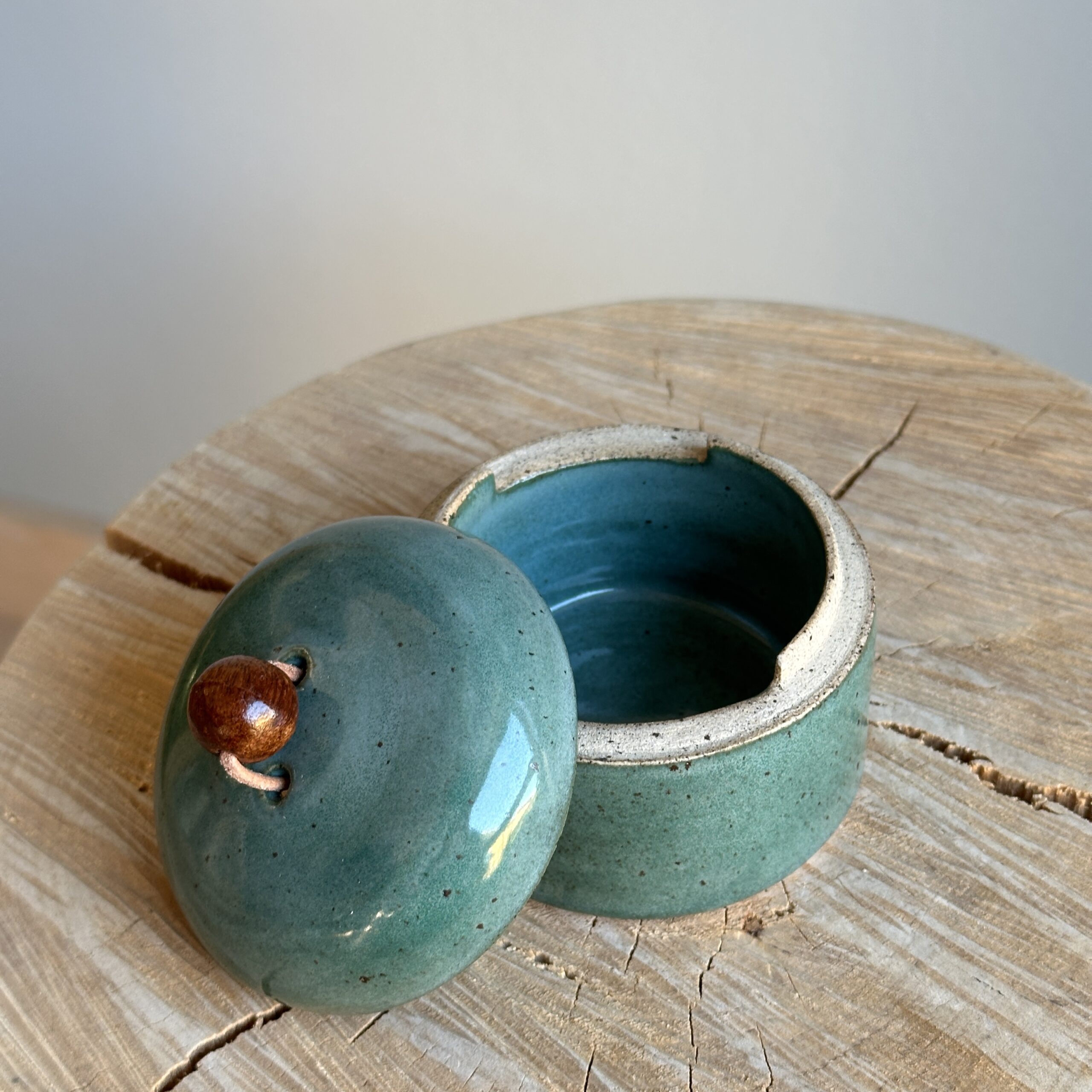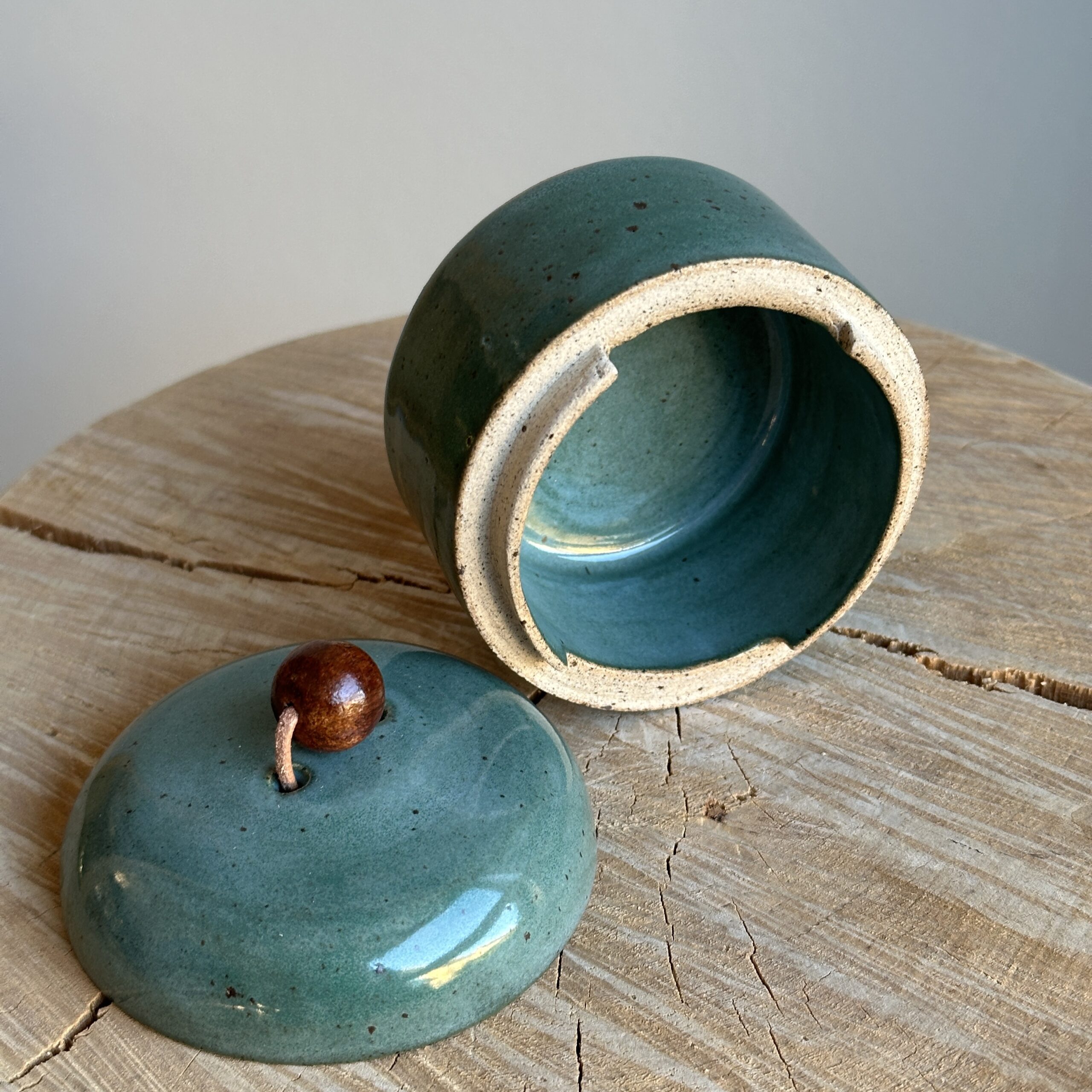 Lille håndlavet skrin i genbrugsler med smuk blå-grøn glasur. Låget prydes af en naturlig træperle som håndtag. Perfekt til smykker, salt eller små hverdagsfavoritter.