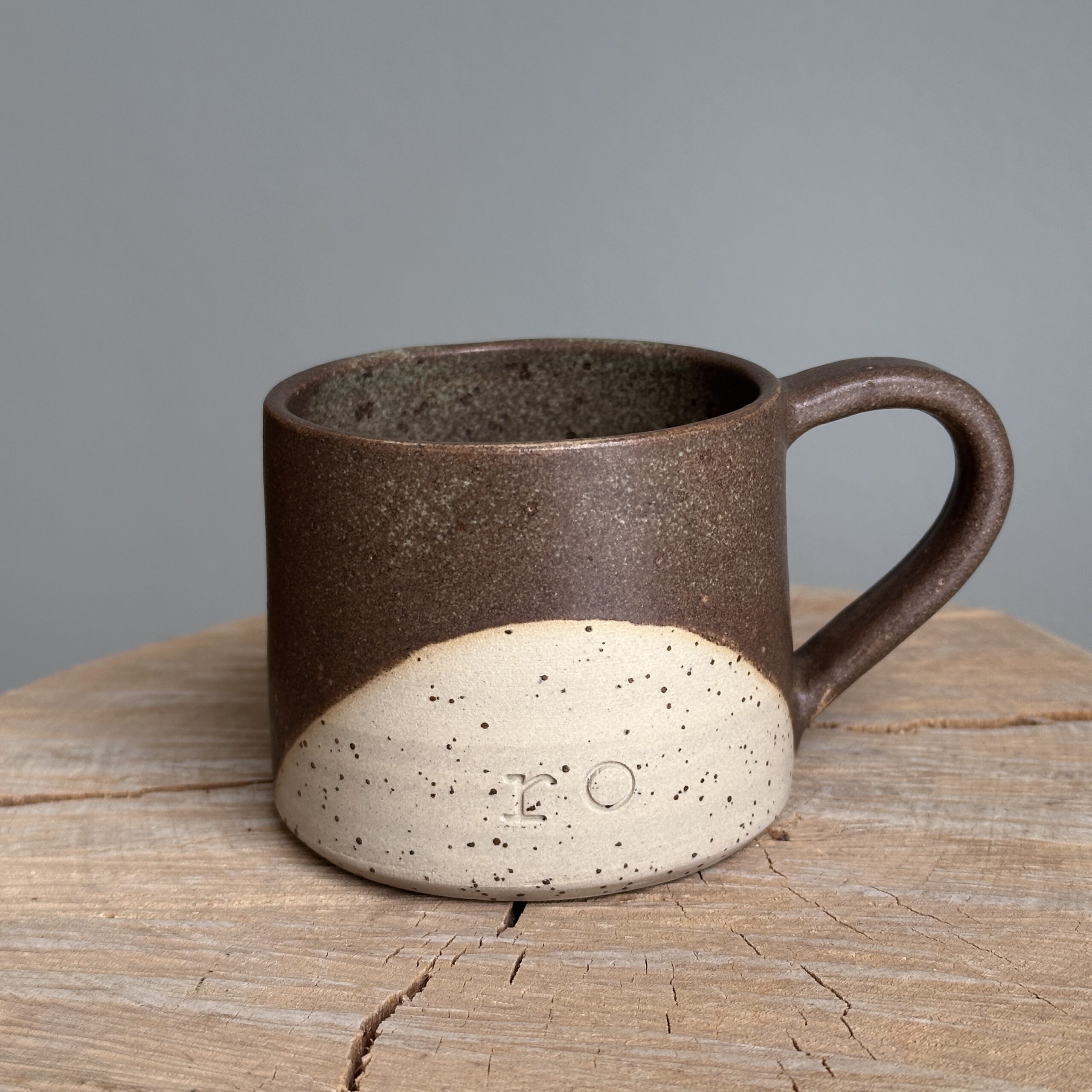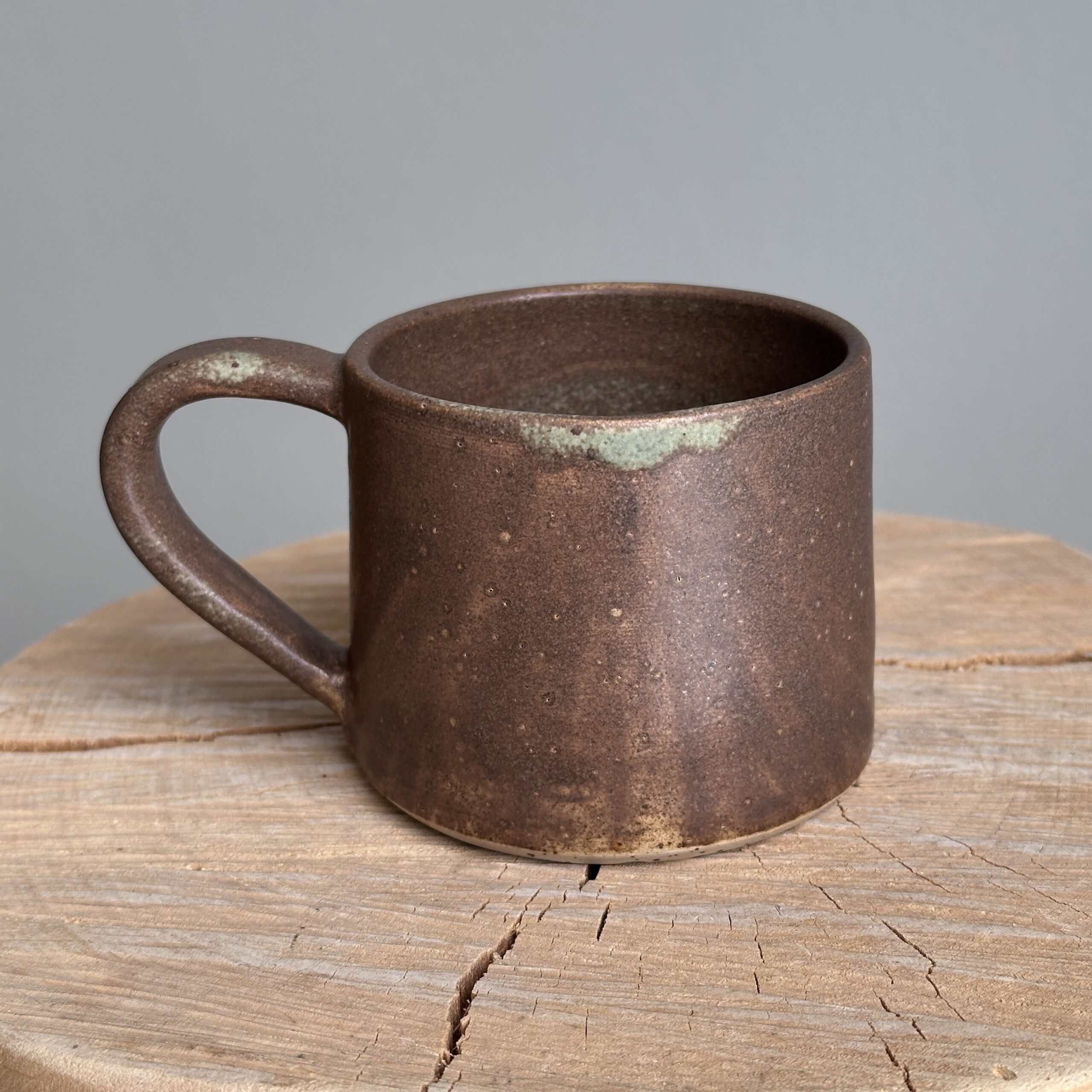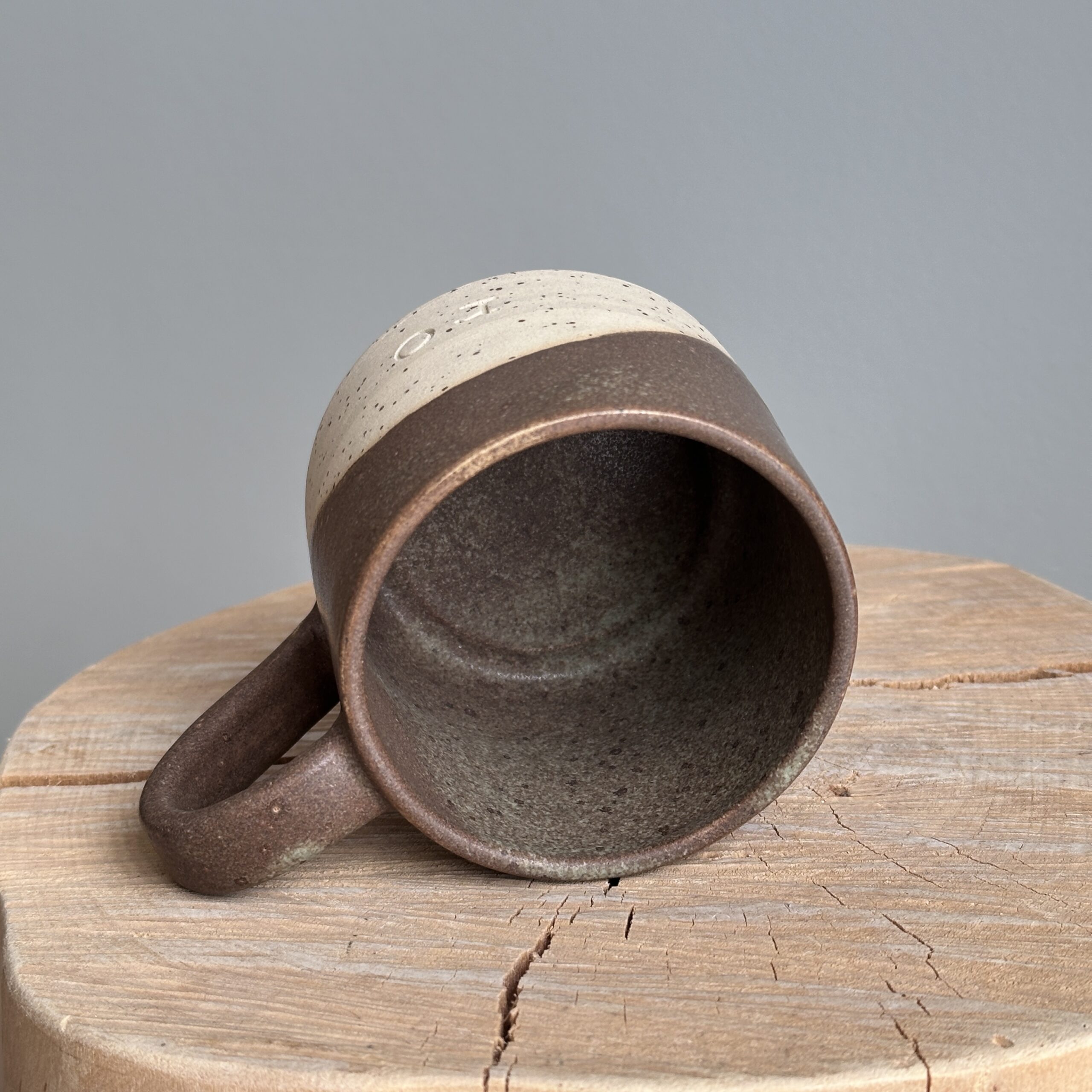 Bring naturens ro til bordet med dette håndlavede krus, drejet i lavaplettet lys stentøjsler og glaseret med en jordnær brun/irgrøn glasur. Farvespillet minder om nordiske landskaber – mos, sten og jord – og giver hvert stykke sin egen unikke karakter.