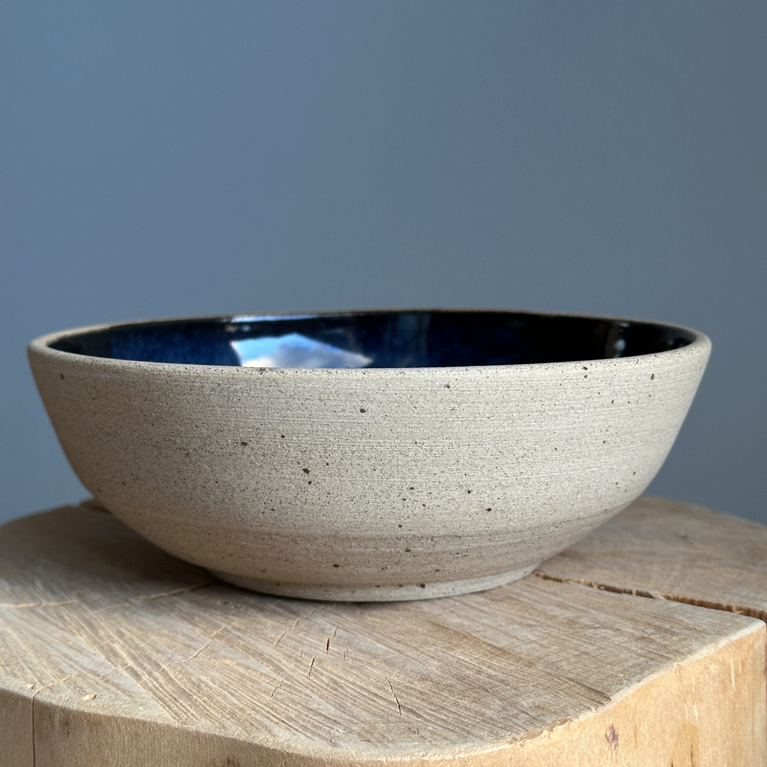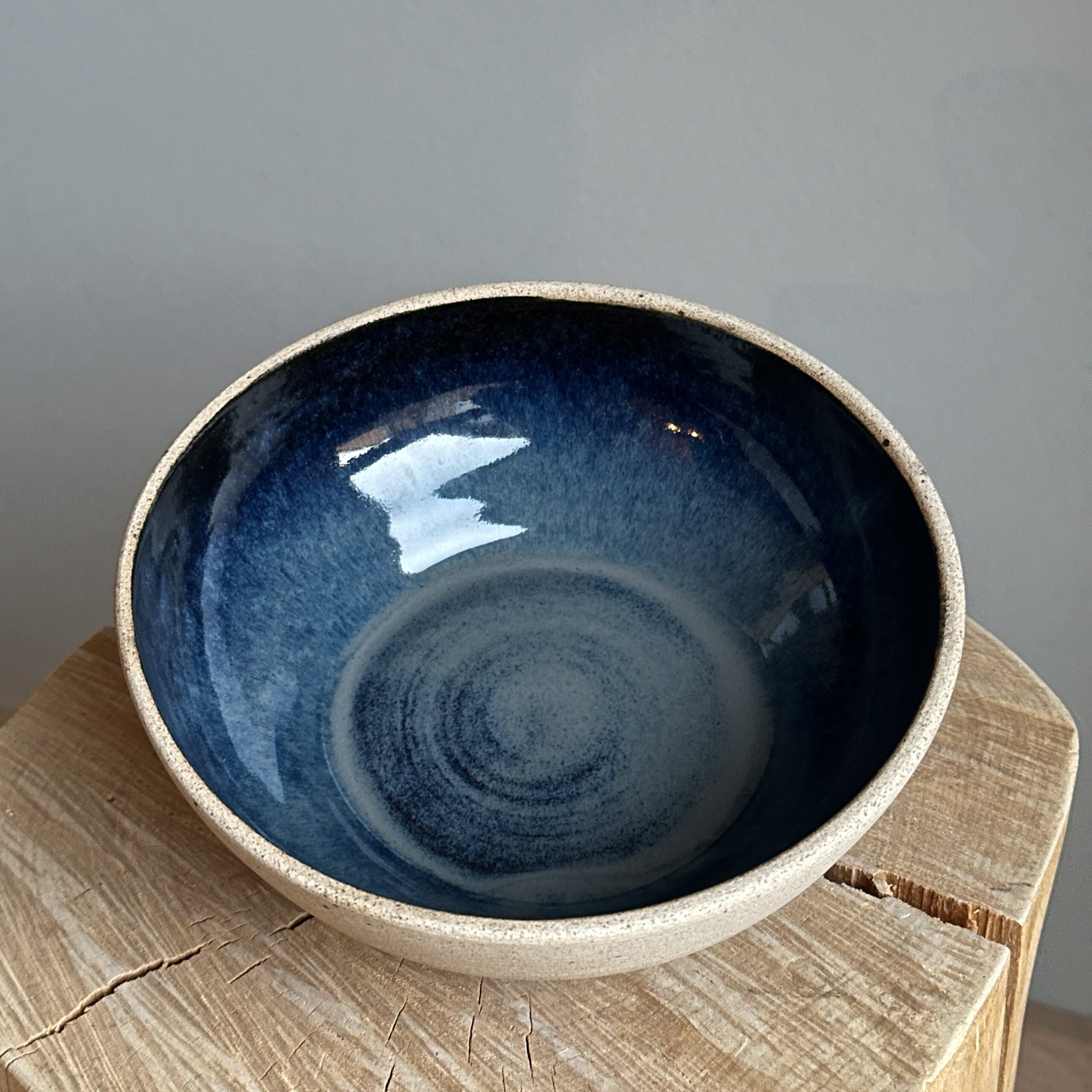 Bring roen fra den nordiske natur ind i dit hjem med denne håndlavede skål drejet i bæredygtigt genbrugsler. Den dybe blå farve er inspireret af skovsøens dybde og himmelens spejlen sig i vandet. Udvendig står den rå glasur, behandlet så det føles silkeblødt.