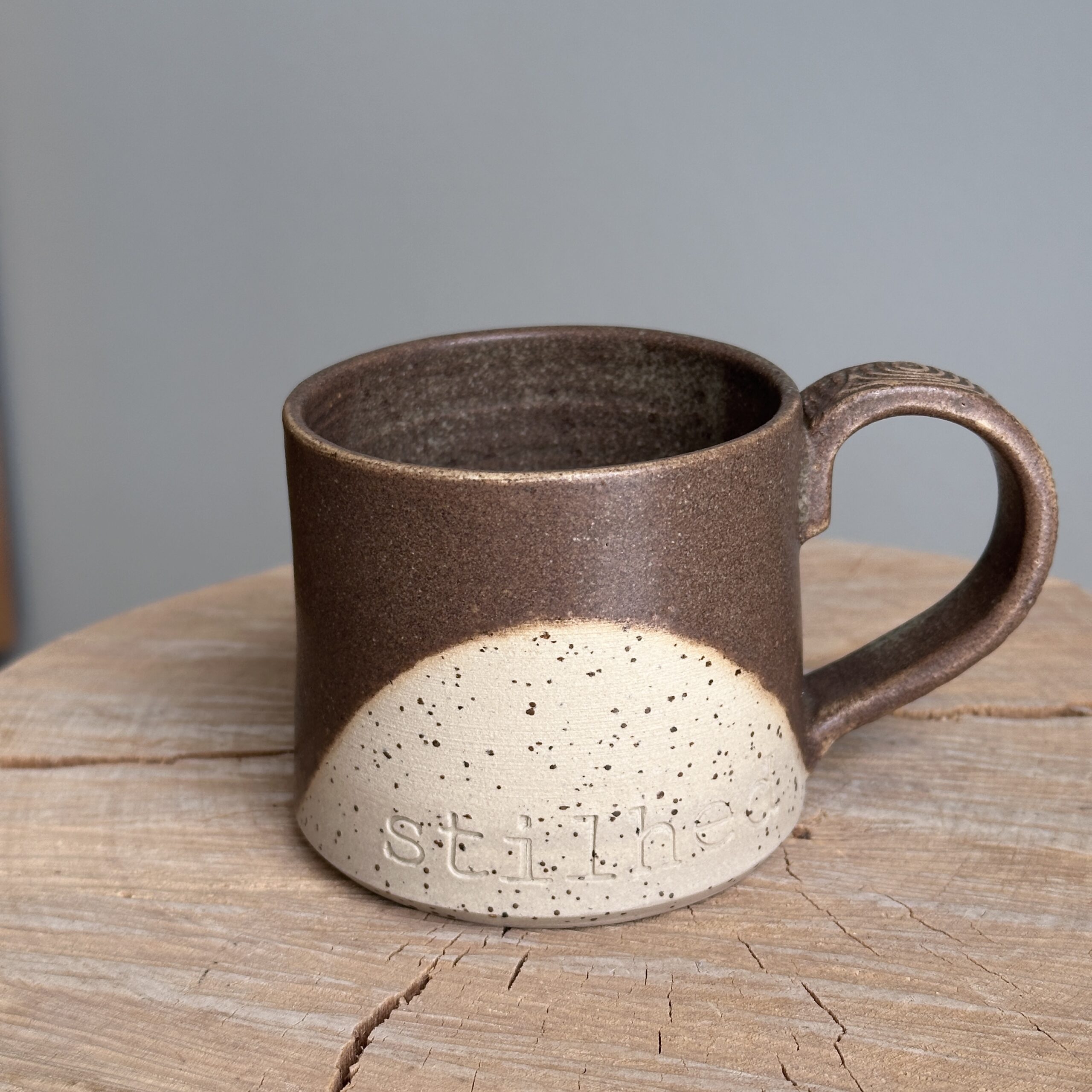 Bring naturens ro til bordet med dette håndlavede krus, drejet i lavaplettet lys stentøjsler og glaseret med en jordnær brun/irgrøn glasur. Farvespillet minder om nordiske landskaber – mos, sten og jord – og giver hvert stykke sin egen unikke karakter.