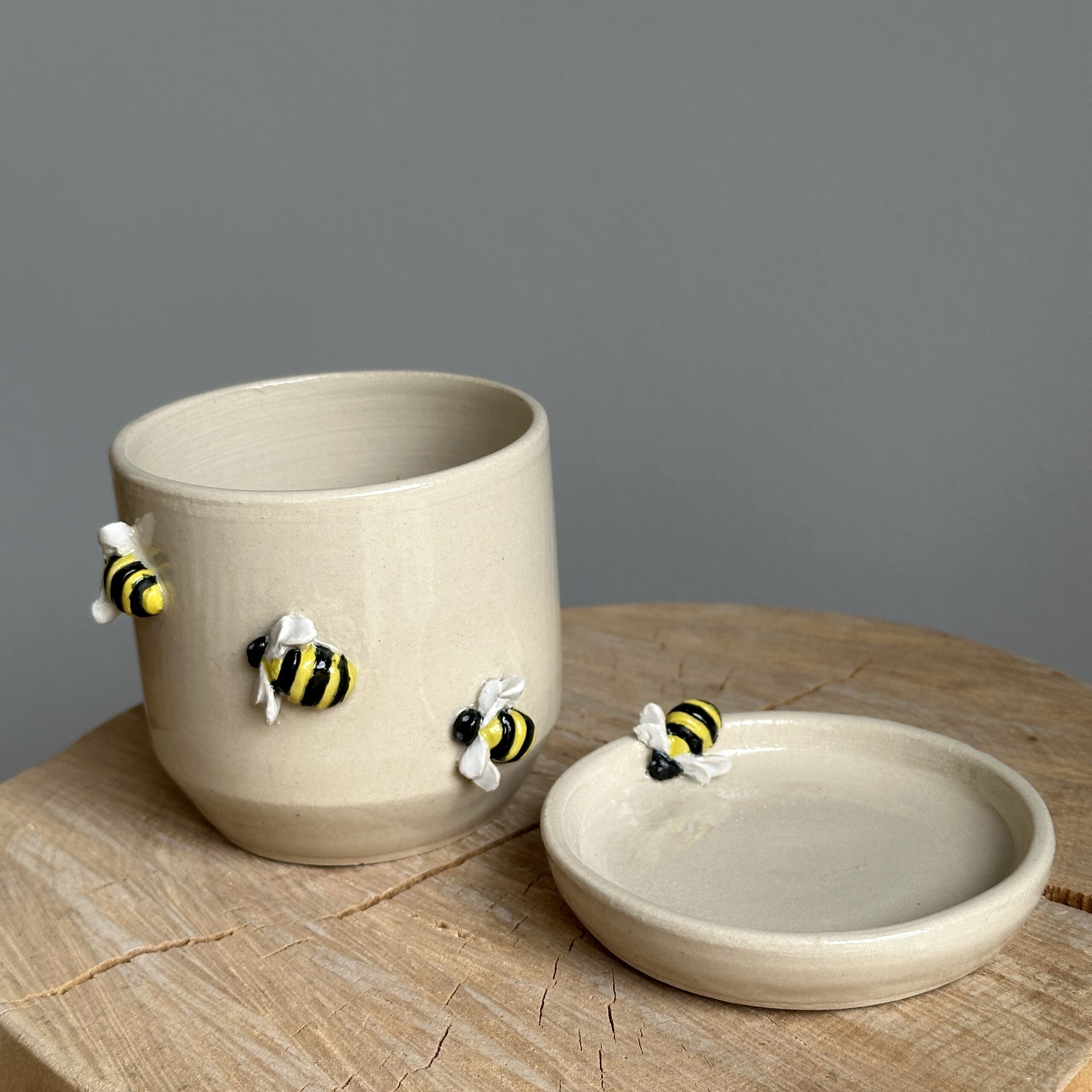 Kruset er formet i hånden, glaseret i en blank glasur og prydet med små, sirlige bier, der summer af liv og håndværk.